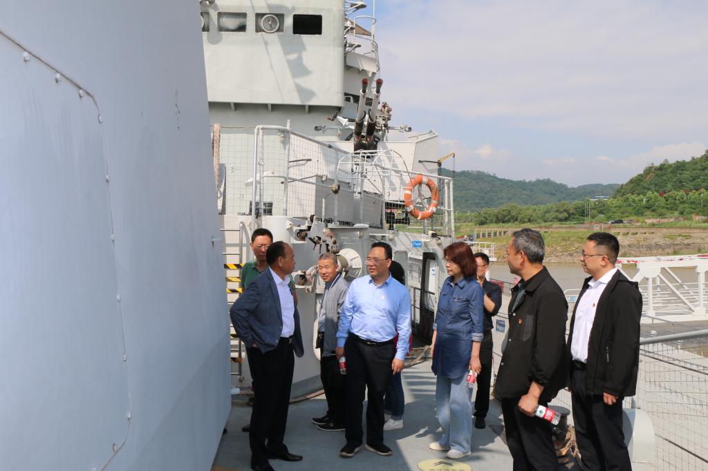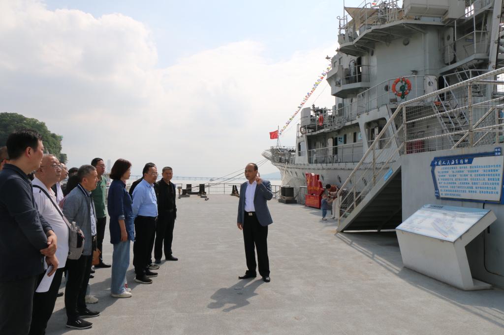 胡仁星详细介绍了“九江舰”的服役历史、火力配备及战略地位,为全体教工党员上了一趟生动的党课。“九江舰”服役四十二年,多次参加全军、海军、舰队组织的台海演习及海上巡逻、护渔护航等急难险重战备任务,为祖国的海防大业屡建功勋。在胡仁星的带领下,党员同志有序参观了“九江舰”各展区,爬旋梯、登甲板、进舱室,实地体验中国军舰曾经的构造配置和海军官兵的艰苦不易。“保家卫国卌二载,劈波斩浪铸军魂。恪尽职守功身退,国防教场再出征。”退役不退色,英雄九江舰在国防教育战场上正发挥着积极作用。